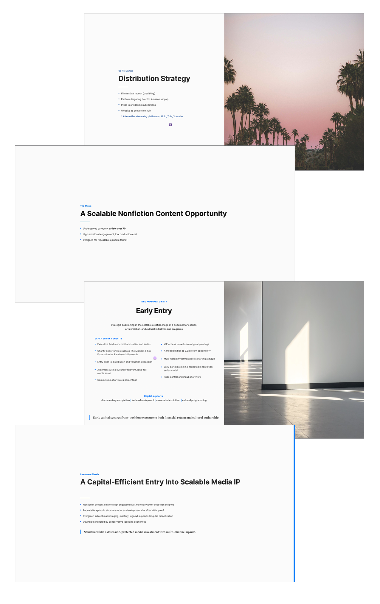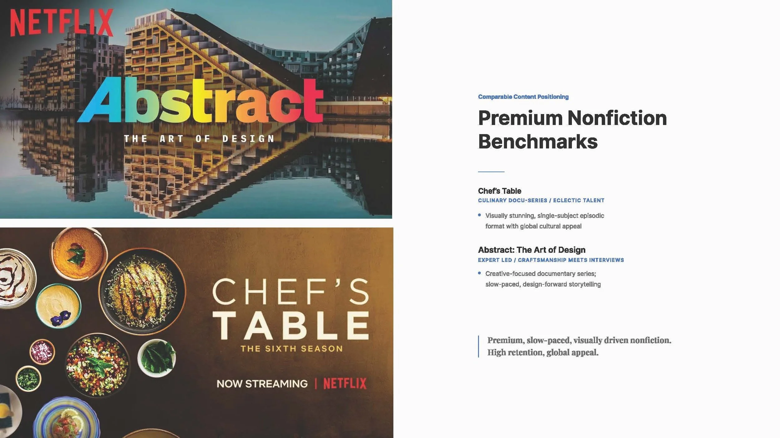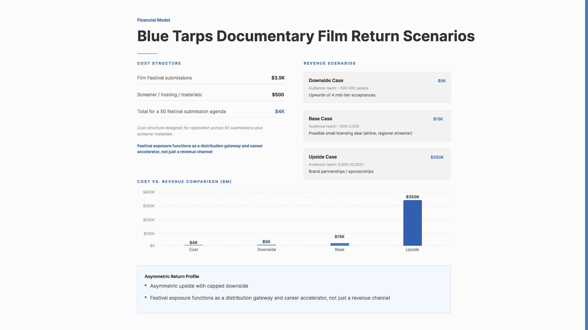 To attract funding for film submissions, I developed the investor deck to showcase comparative models, and potential return on investment using previously developed similar films and series as the benchmark for investment numbers.